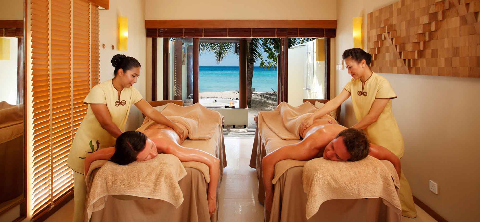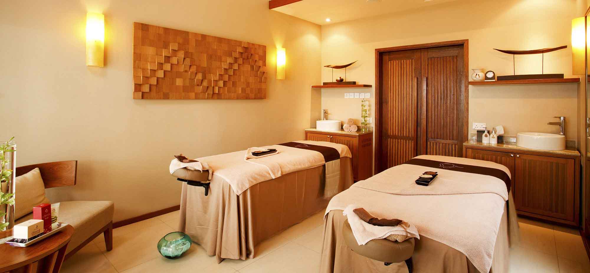 设有单人和双人情侣套房、附有按摩浴缸的疗程室、独立泰式按摩凉亭馆,以及一座观赏海滩及环礁湖美景的场馆,在此可享受早晨瑜珈和美甲沙龙。