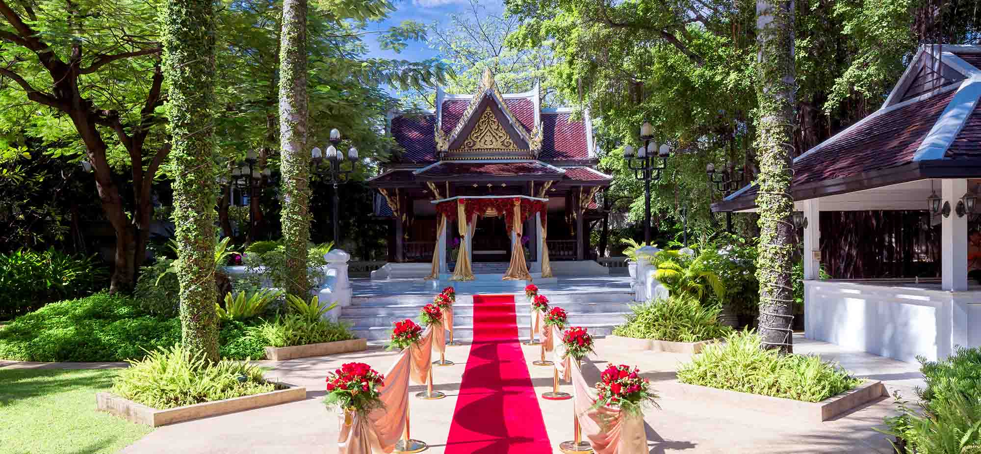 - Stage for the ceremony, including a Buddhist altar, two vases, and two flower stands