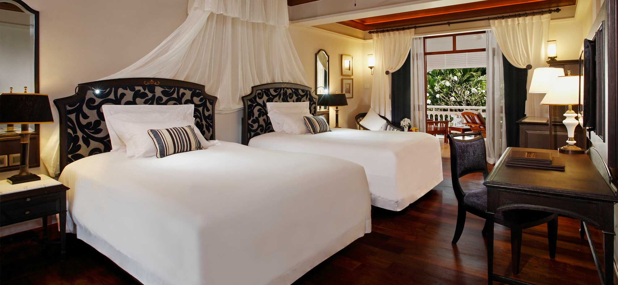 体验经典优雅的专属双卧室复合套房,每间套房设有独立睡眠区和起居区,以奶油色和白色为主色调,搭配优雅装潢,仿古风格的家具和多彩泰国丝绸面料。生活区拥有超过130平方米面积,设有两间卧室配有豪华的加大双人床和两张双人床,另有两个浴室,可容纳4名成人和2名孩童的家庭或团体。 阳台和大落地窗供您观赏花园和泳池美景,为套房增添宽敞空间。