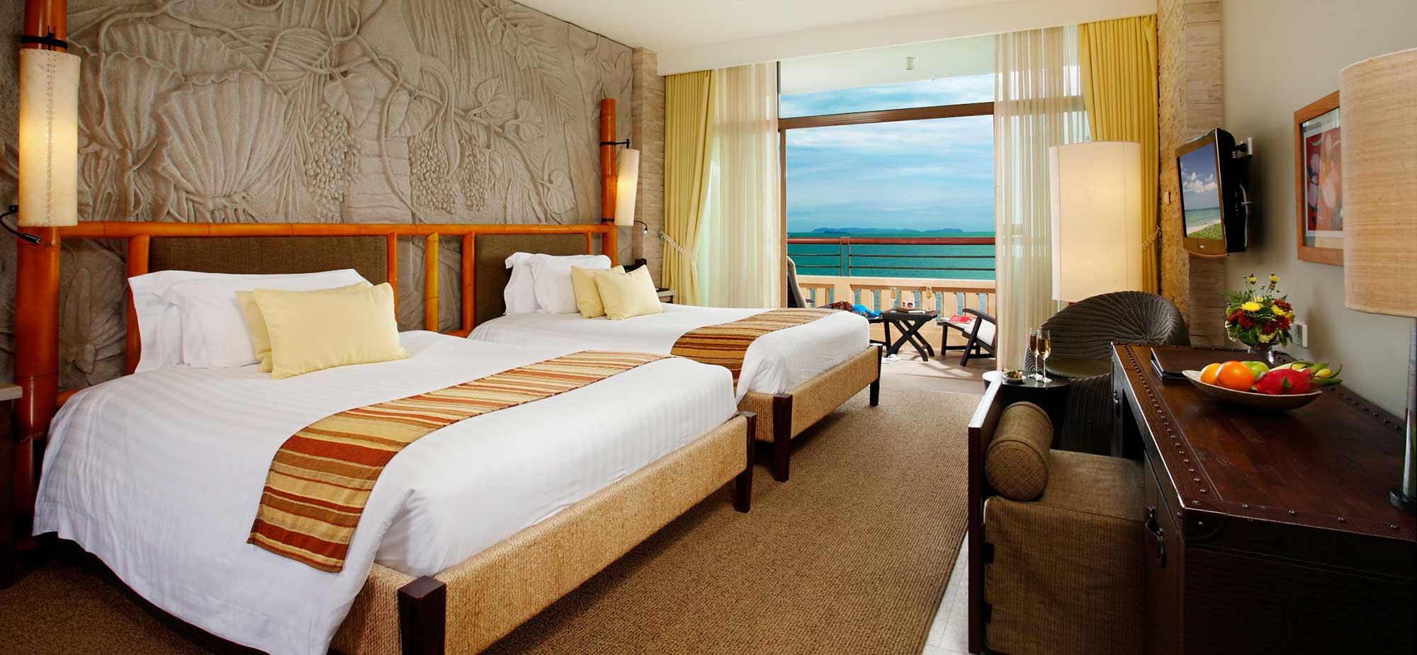 备有115间的高级豪华海景房,每间房拥有42平方米宽敞空间,室内浅色调的原木风格搭配失落世界主题设计,提供您舒适的生活环境。配有附家具的露天阳台,可欣赏滑水道和海畔风光,更有附设独立淋浴的浴室 。旅客可因需求选择一张特大号双人床或两张双人,可容纳多至三位成人,或两位成人携带两位孩童,是情侣或家庭旅游的理想房型首选。室内设备則包含独立操控空调、迷你酒吧、沏茶和咖啡设备、室内保险箱、设有卫星频道 ...