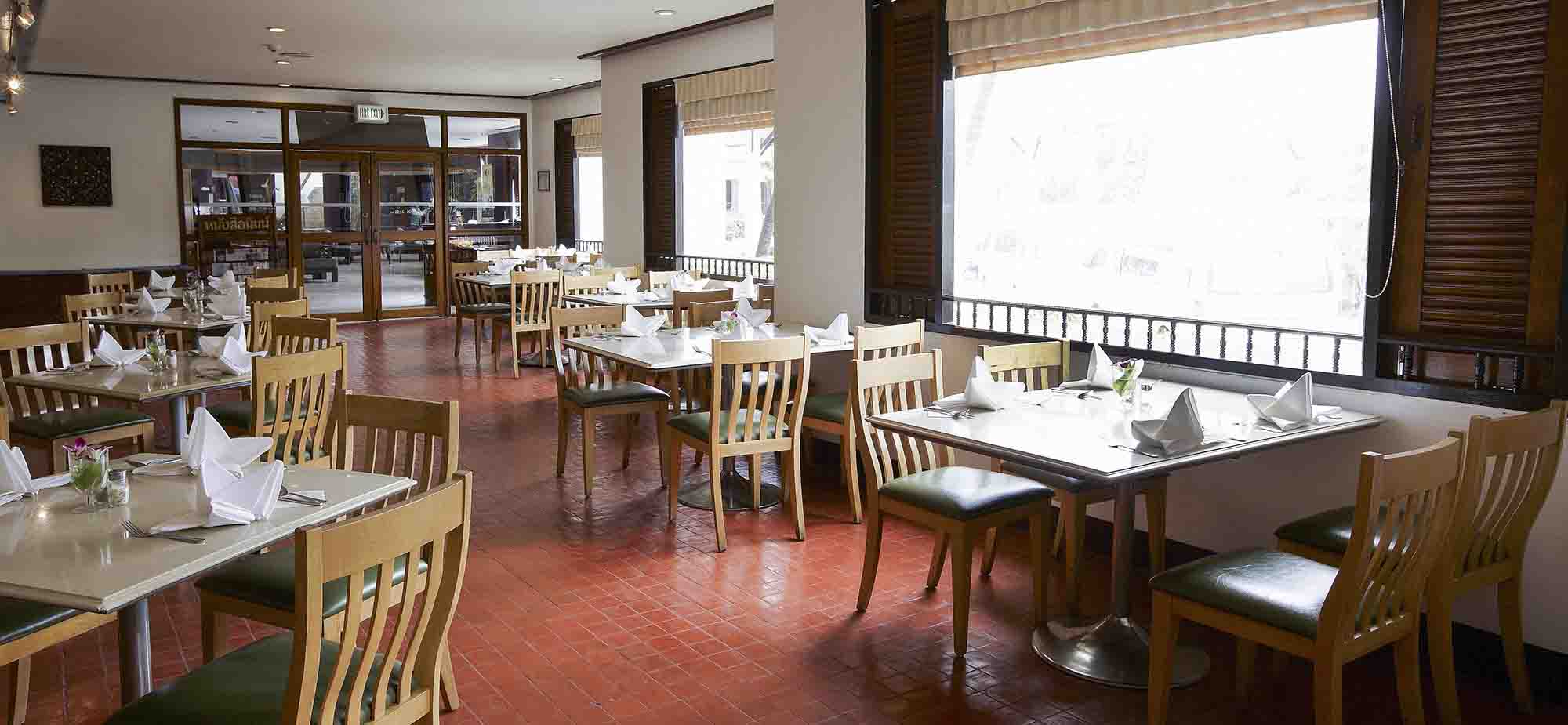 River Moei 咖啡馆位于底层,供应早、中、晚餐,主要菜品包括泰国菜和国际美食,招牌菜有牛柳、泰式炒面和泰式打抛鸡。 此外还定期供应自助晚餐。